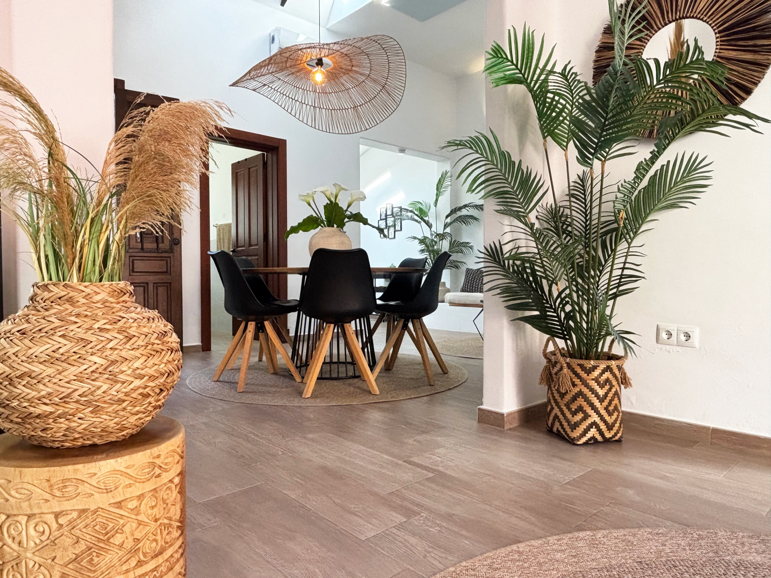 Un chalet moderno y tranquilo de vacaciones. Se ha respetado el estilo Malagueño y grandes ventanales. Todo ello se ha complementado con elementos modernos como la nueva cocina y baños y la cálida decoración.
